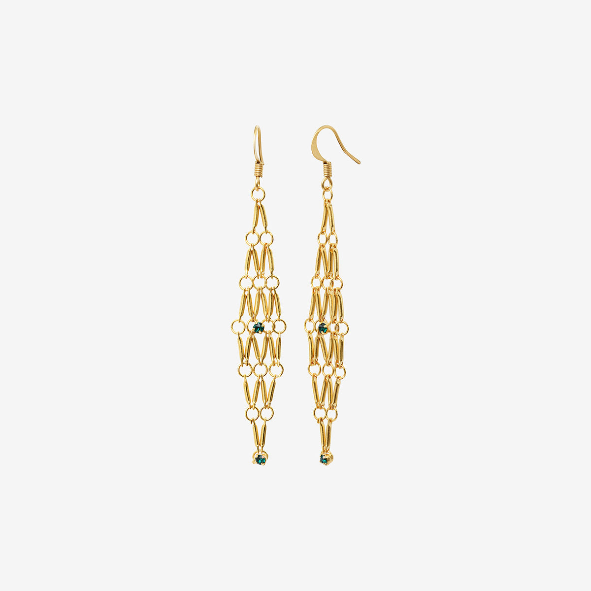 Ces boucles d'oreilles, affichent une finition brillante qui attire le regard. Leur forme allongée et géométrique, avec des maillons entrelacés, crée une structure délicate et aérée. Les petites pierres de couleur vert, façonnées dans des usines d'Autriche, sont le fruit d'un long travail de développement et d'un contrôle qualité rigoureux.