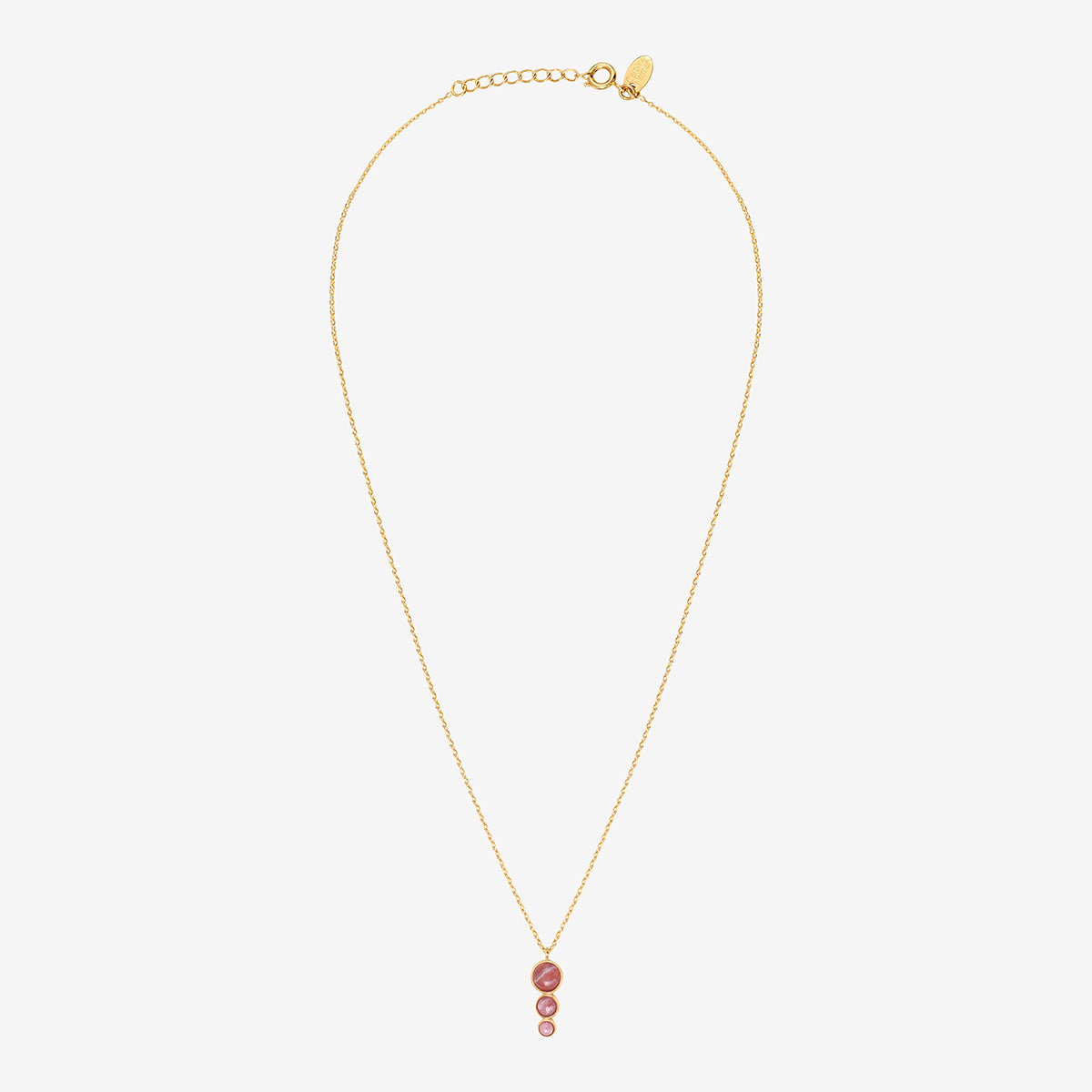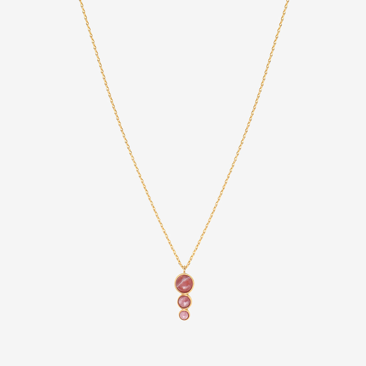 Ce collier se distingue par son pendentif en forme de goutte, orné de trois cabochons de pierres fines en rhodochrosite, une pierre réputée pour ses vertus d'amour et de compassion. La couleur rose délicate de la rhodochrosite apporte une touche de douceur et d'harmonie au bijou.