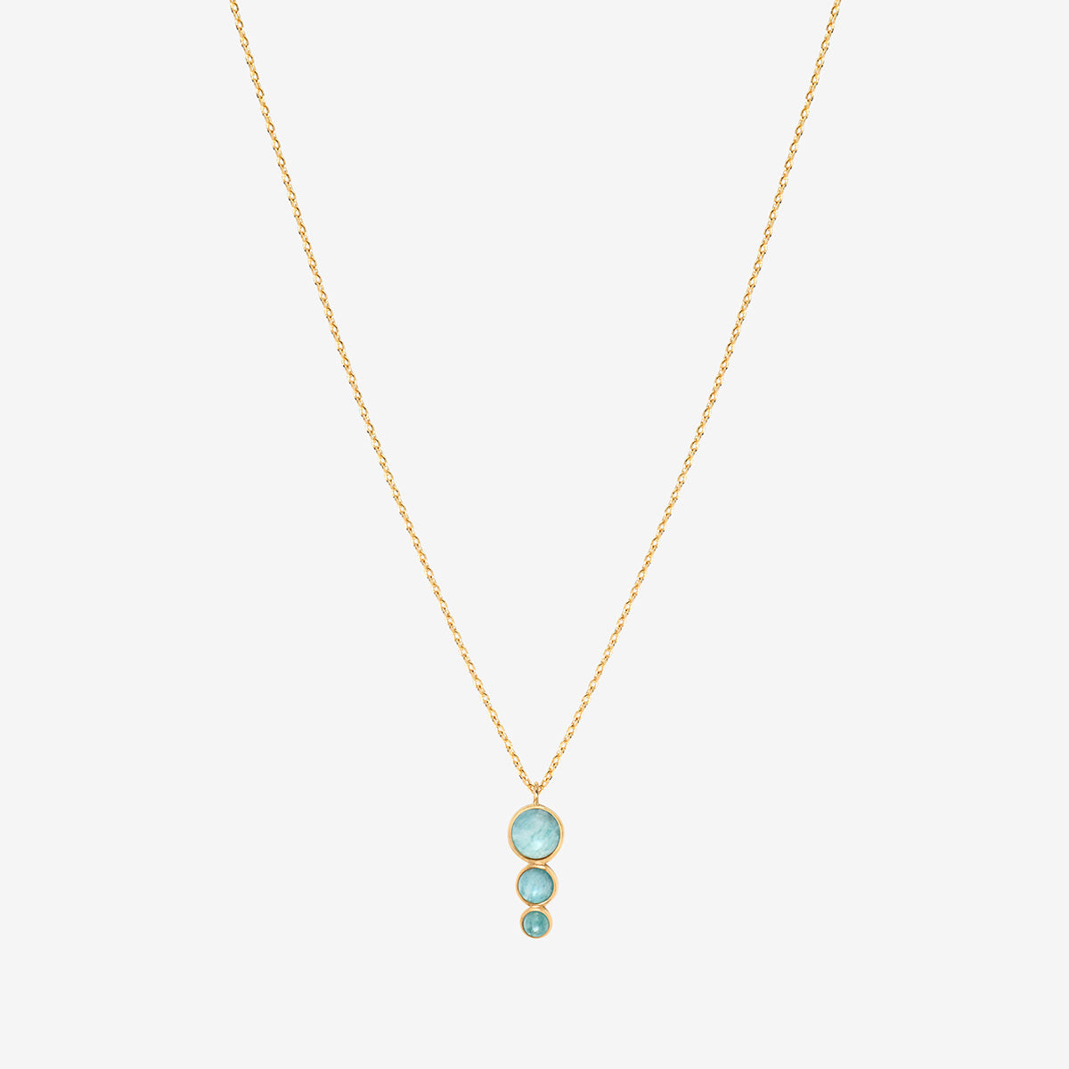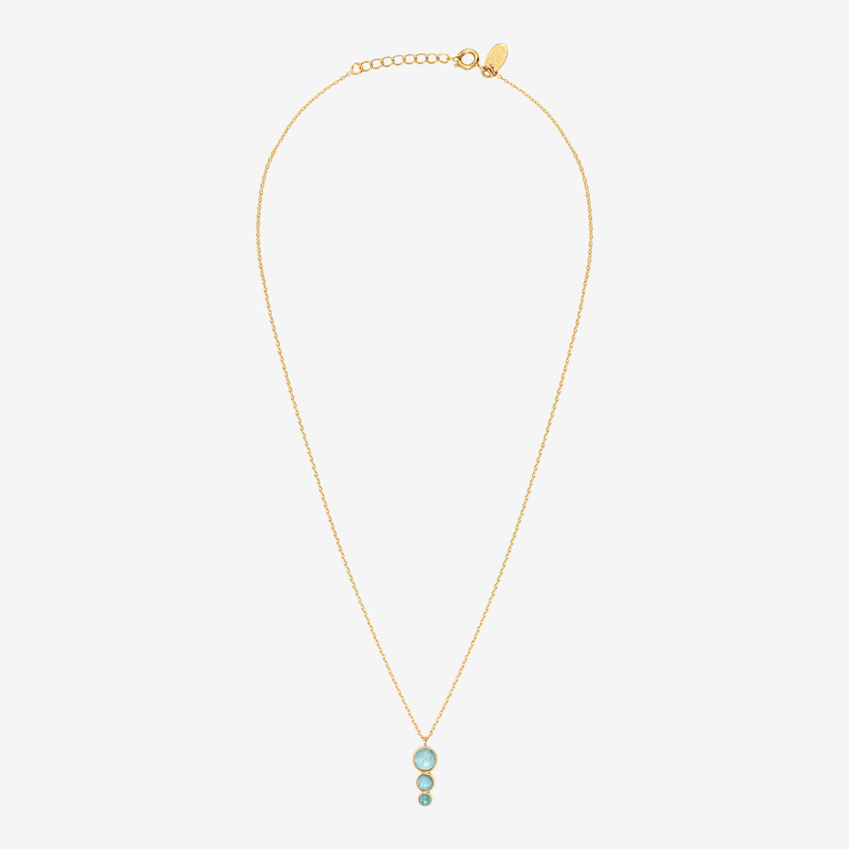 Le collier ANDREA est un bijou raffiné, doré à l'or fin 24 carats, qui allie élégance et délicatesse. Son design unique est sublimé par un sertissage clos qui met en valeur trois cabochons en amazonite, une pierre réputée pour sa joie de vivre et ses propriétés apaisantes.