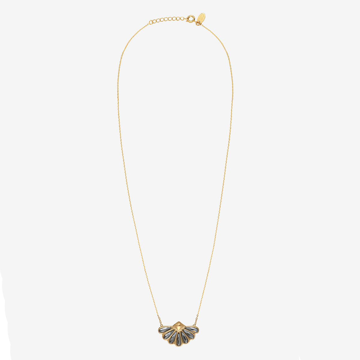 Ce collier se distingue par sa couleur dorée, rehaussée par des éléments en gris, qui ajoutent une élégance subtile. Fabriqué en laiton, il présente un aspect brillant et raffiné, tandis que les cristaux façonnés dans des usines d'Autriche témoignent d'un travail de qualité et d'un contrôle rigoureux.