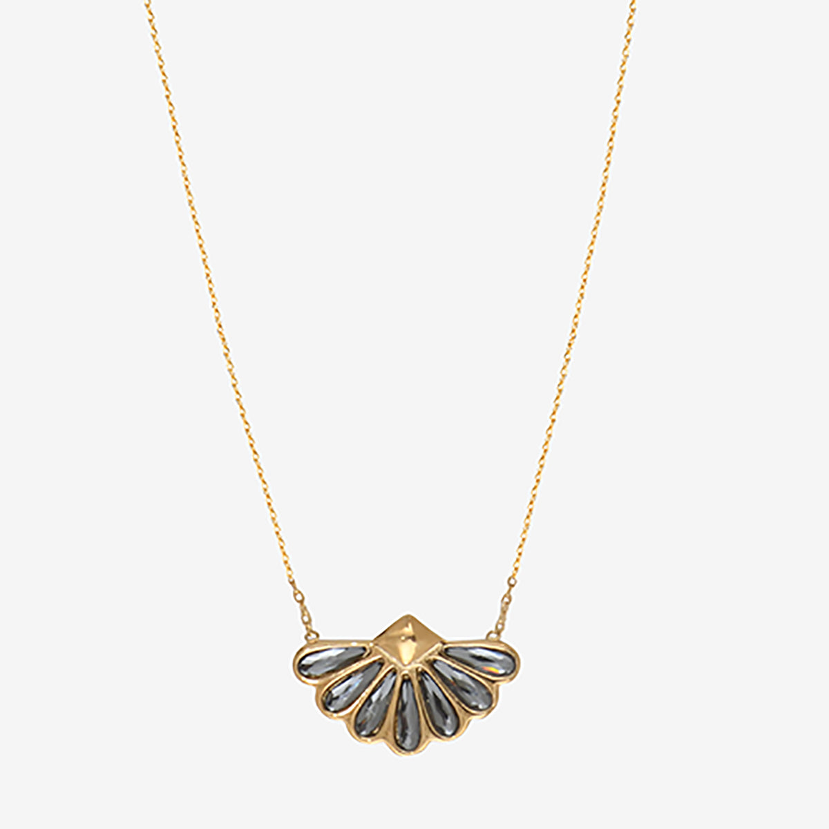 Le collier doré CALYPSO de la marque Caroline Najman est un bijou d'exception, doré à l'or fin 24 carats. Son design finement ouvragé, en forme d'éventail déployé, est serti de 7 cristaux d'un éclat sophistiqué, apportant une touche de glamour intemporel à vos tenues.