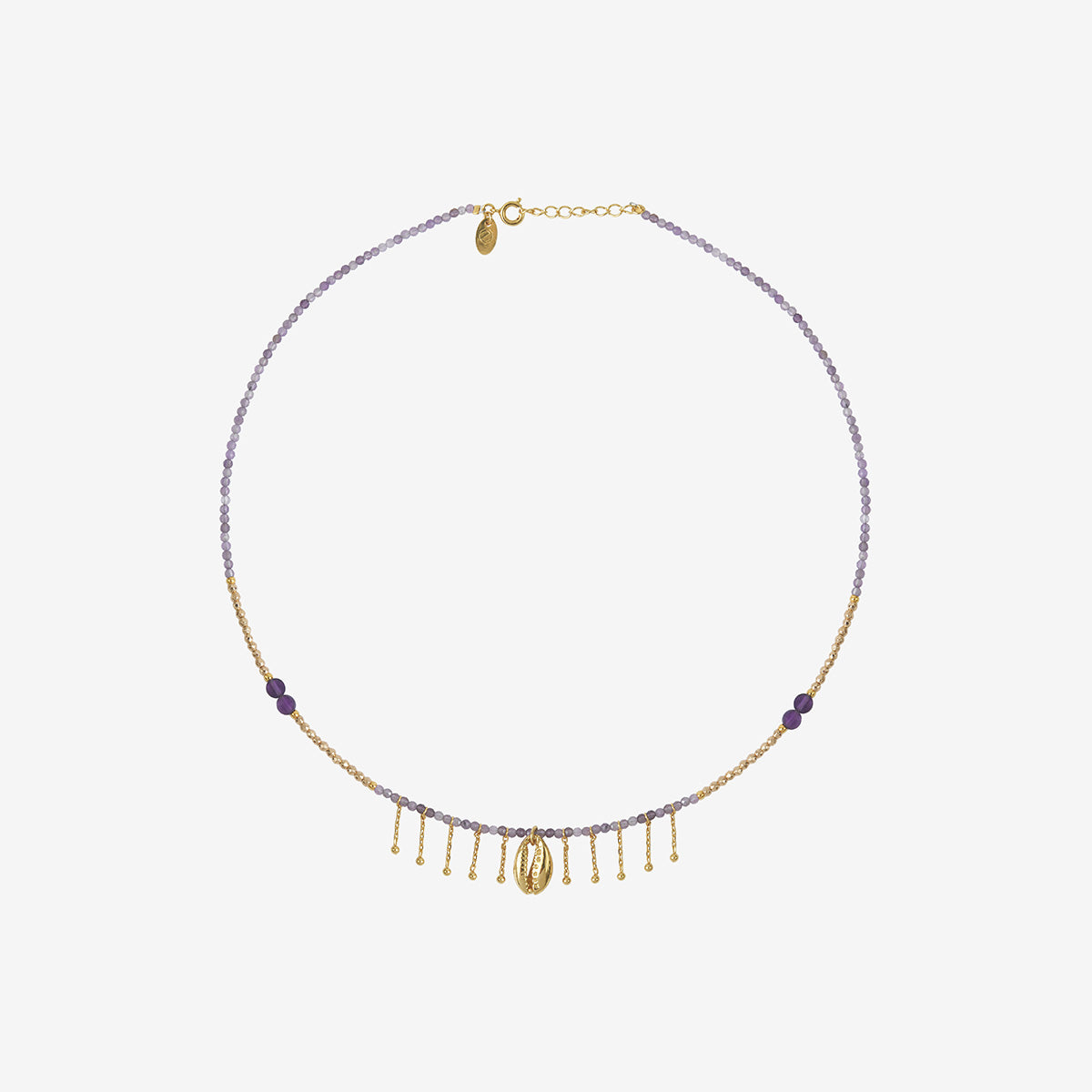 Ce collier est également doté d'une pierre d'améthyste, reconnue pour ses propriétés apaisantes, contribuant à réduire le stress et favorisant un sommeil paisible. En astrologie, l'améthyste est liée aux signes du Scorpion, du Poisson et de la Balance, ajoutant une dimension spirituelle à ce bijou.