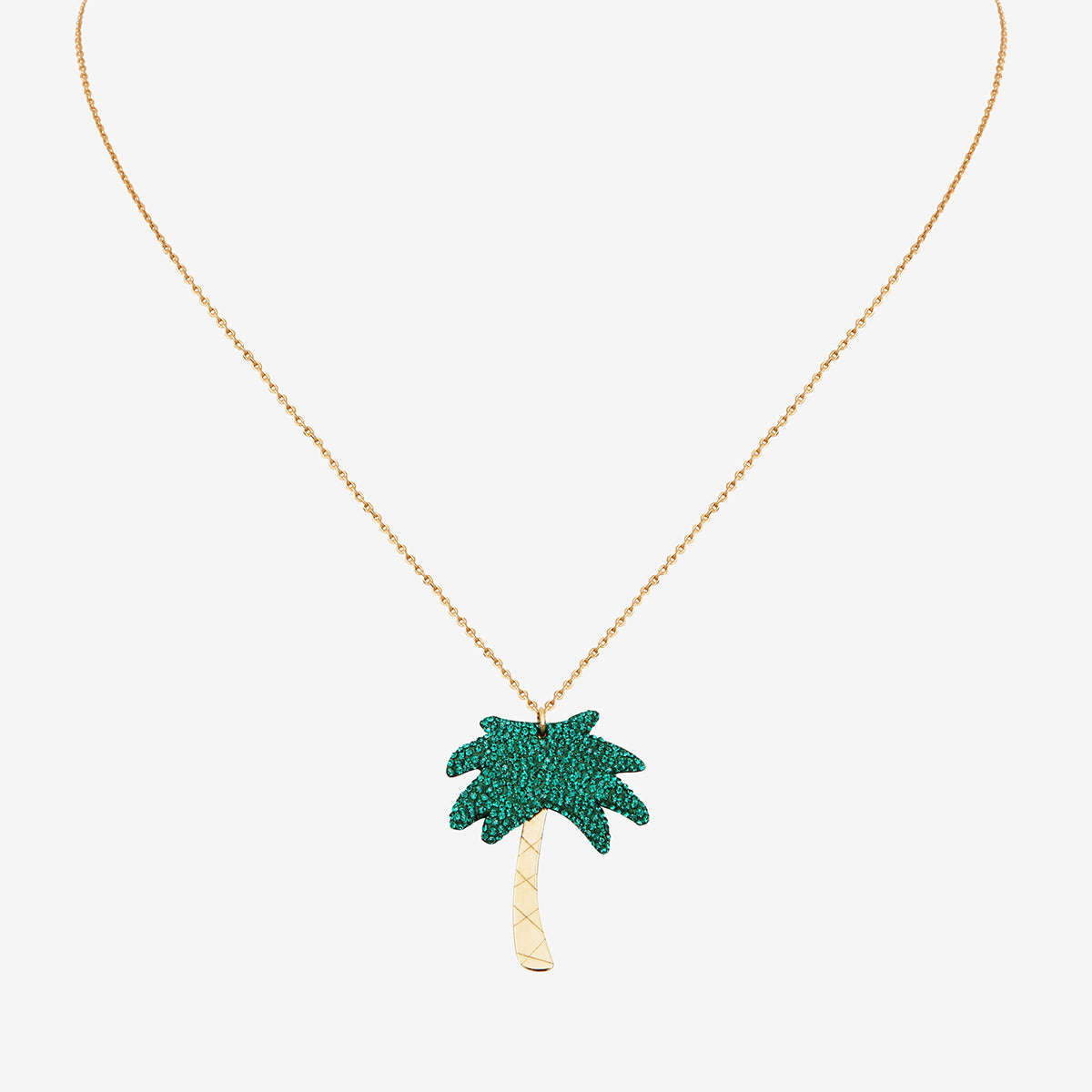 - Couleurs : une chaîne dorée et un pendentif agrémenté de pierres vertes qui imitent les feuilles du palmier, créant un contraste saisissant.