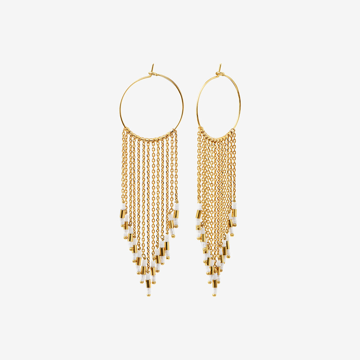 Les 128 perles en verre qui embellissent ces boucles sont choisies pour leur régularité irréprochable, fruit d'un savoir-faire maîtrisé. Ce détail artisanal fait de chaque paire un bijou unique, parfait pour les occasions spéciales ou pour sublimer une tenue quotidienne.