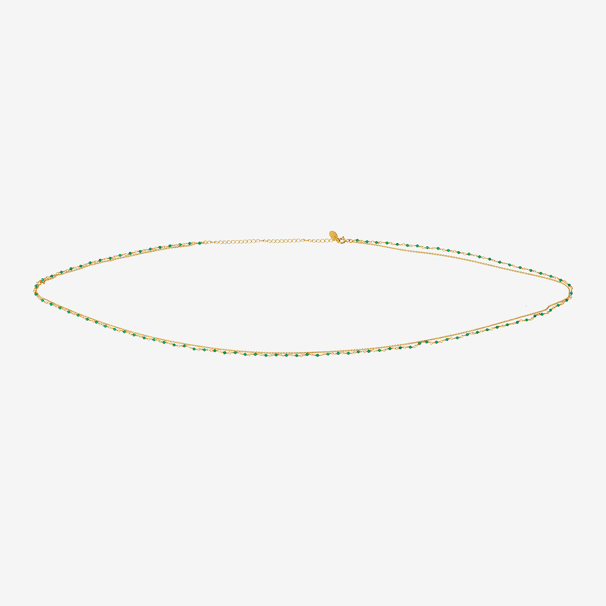 Cette chaîne est ornée de Quartz Vert, une pierre connue pour ses propriétés bénéfiques, stimulant l'élimination des toxines et renforçant la volonté. En astrologie, elle est associée aux signes de la Balance, du Capricorne et du Cancer.