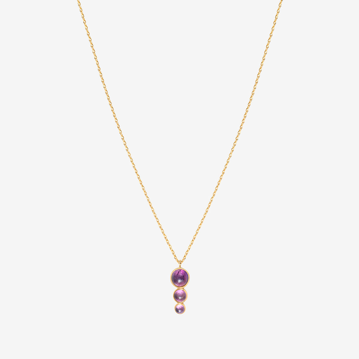 Ce collier se distingue par son pendentif orné de trois cabochons en améthyste, une pierre reconnue pour ses effets apaisants sur la nervosité et le stress. L'améthyste, de couleur violette, est également réputée pour favoriser un sommeil paisible et éloigner les mauvais rêves. Elle est liée aux signes astrologiques du Scorpion, du Poisson et de la Balance.