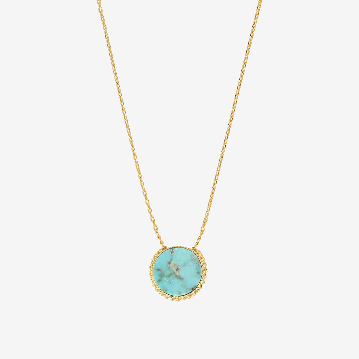 Ce collier est orné d'une pastille plate de 10 mm en turquoise, une pierre fine naturelle réputée pour ses vertus apaisantes. La turquoise facilite la communication et diminue le stress lié à l'expression en public, tout en inspirant calme et sérénité.