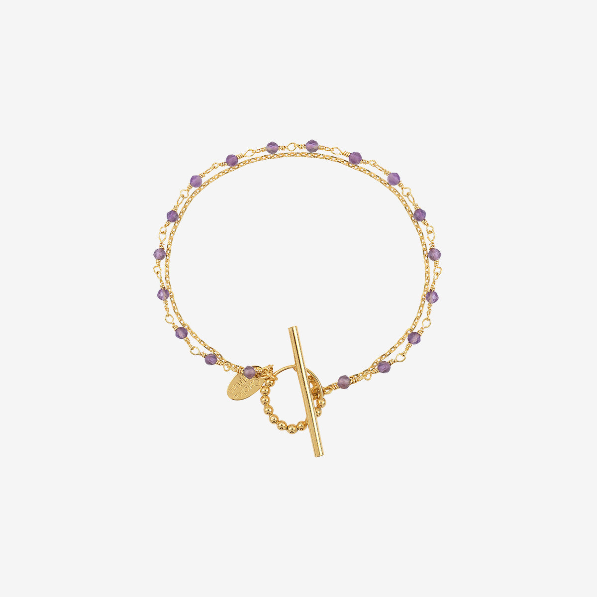 Le bracelet doré ROXANE est une pièce unique qui allie élégance et délicatesse. Doré à l'or fin 24 carats, il se distingue par son design raffiné et sa légèreté. Ce bracelet est composé de deux chaînes : une métallique et une ornée de pierres fines naturelles, dont l'améthyste, qui apporte une touche de couleur violette sophistiquée.