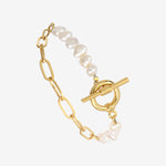 Le bracelet doré LUCIE est un bijou qui allie élégance naturelle et caractère. Fabriqué en laiton doré à l'or fin 24 carats, il se compose de perles de culture blanches aux formes irrégulières, créant un contraste saisissant entre la brillance du métal et la douceur des perles.