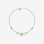 Le collier doré Esmé de la collection INDIE est un bijou élégant et raffiné, conçu pour apporter une touche de sophistication à toutes vos tenues. Fabriqué en laiton doré à l'or fin 24 carats, ce collier se distingue par son mélange harmonieux de couleurs, alliant le doré et un vert vibrant grâce à ses perles d'agate verte.