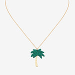 - Couleurs : une chaîne dorée et un pendentif agrémenté de pierres vertes qui imitent les feuilles du palmier, créant un contraste saisissant.