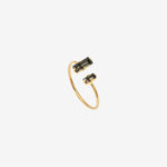 Fabriquée en laiton et dotée d'une finition plaquée or, cette bague se distingue par sa couleur dorée éclatante. Les pierres, d'une teinte gris sombre, créent un joli contraste avec l'anneau, tout en ajoutant une note contemporaine grâce à leur disposition asymétrique.