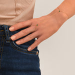 Ce modèle se distingue par son design minimaliste et moderne. Il présente une chaîne fine qui s'étend le long de la main, se terminant par une forme en goutte. Deux petites pierres d'agate verte sont intégrées, ajoutant une touche de couleur et de sophistication, tout en créant un joli contraste avec le doré.