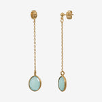 Chaque paire est ornée de deux pierres facettées en calcédoine bleue, qui apportent une touche de couleur douce et apaisante. La calcédoine est reconnue pour ses propriétés d’apaisement et d’ouverture aux autres, renforçant la confiance en soi. Ces boucles d'oreilles mesurent 5 cm de longueur et 0,9 cm de largeur, ce qui les rend idéales pour compléter une tenue chic ou décontractée.