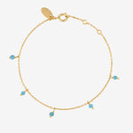 Ce bracelet se distingue par sa chaîne fine ornée de cinq petites perles de turquoise, qui apportent une note de fraîcheur et de couleur. Les perles sont harmonieusement suspendues, créant un mouvement délicat qui évoque une légèreté pétillante. La turquoise, connue pour ses vertus apaisantes, favoriserait la communication et diminuerait le stress, ajoutant ainsi une dimension bien-être à ce bijou.