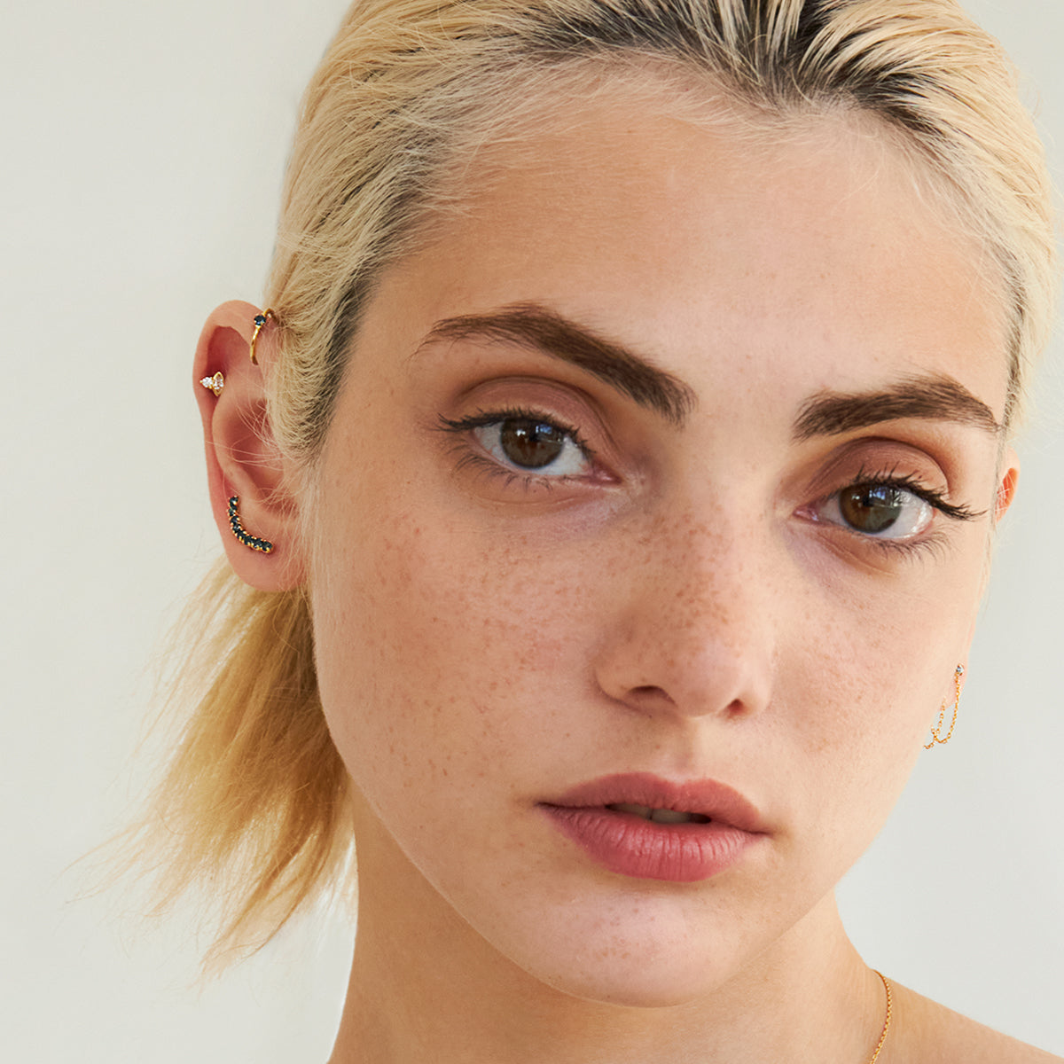Le dessus d'oreille doré solo - PARIS de la marque Caroline NajMAN est un bijou délicat qui incarne l'élégance et la sophistication. Fabriqué en laiton doré à l'or fin 24 carats, il est orné de 8 cristaux Swarovski® de 2 mm de diamètre, soigneusement sertis pour suivre la courbe naturelle du lobe de l'oreille.
