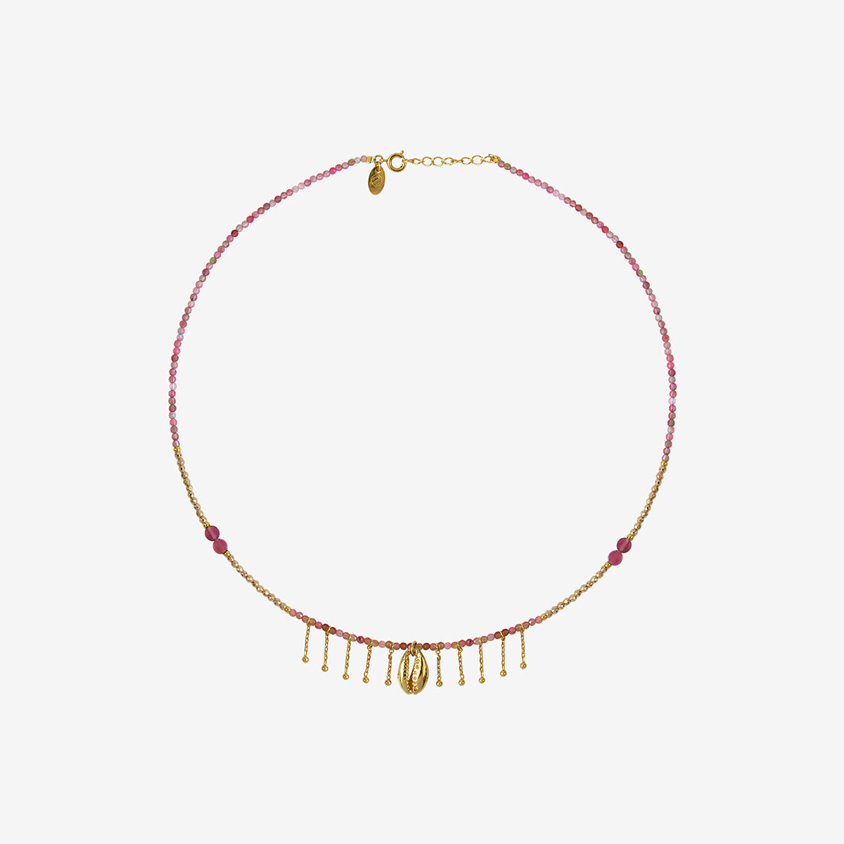Ce collier est doré à l'or fin 24 carats, offrant une finition brillante et luxueuse. Il est orné de petites perles roses qui ajoutent une note de couleur douce et féminine, harmonieusement disposées le long de la chaîne.