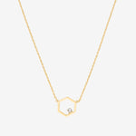 The Honey necklace is plated in 24-karat gold. This hexagonal piece is adorned with a sparkling crystal. A delicate blend of modern geometry and a touch of sweet brilliance.