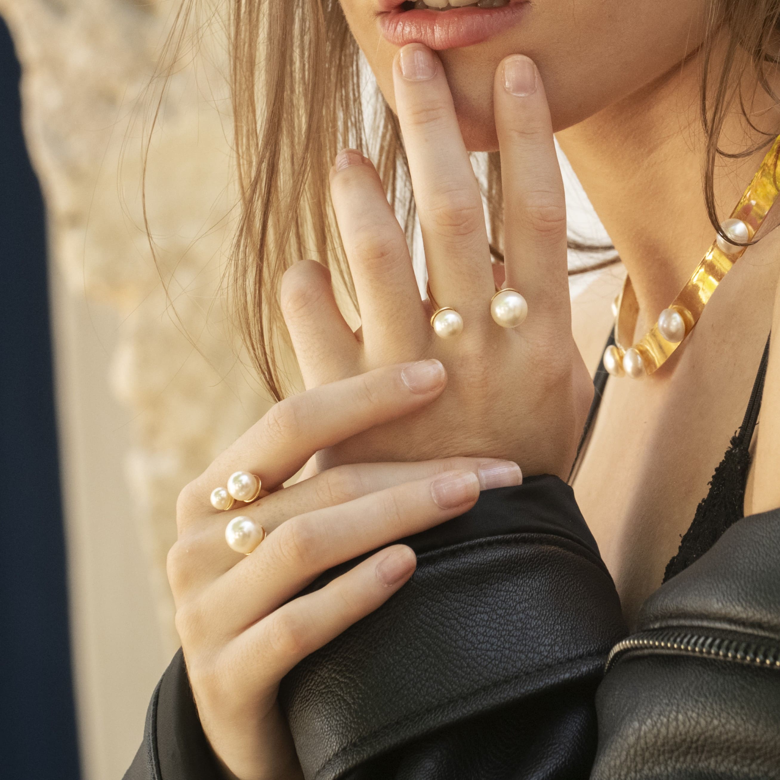 This piece features a refined design with three white pearls of different sizes, arranged asymmetrically on a thin ring. The pearls, crafted in Austrian factories, are the result of extensive development work and rigorous quality control, guaranteeing their brilliance and durability.
