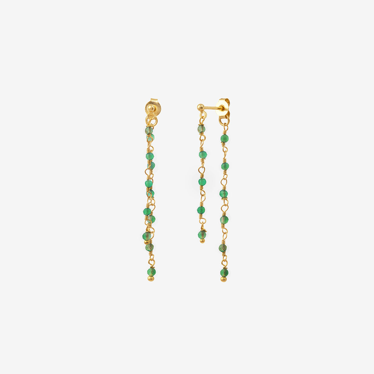 The ROXANE double gold earrings are an elegant and refined accessory, gilded with 24 carat fine gold . Their delicate design consists of dangling chains adorned with small green quartz beads , bringing a touch of color and sophistication to your outfit.