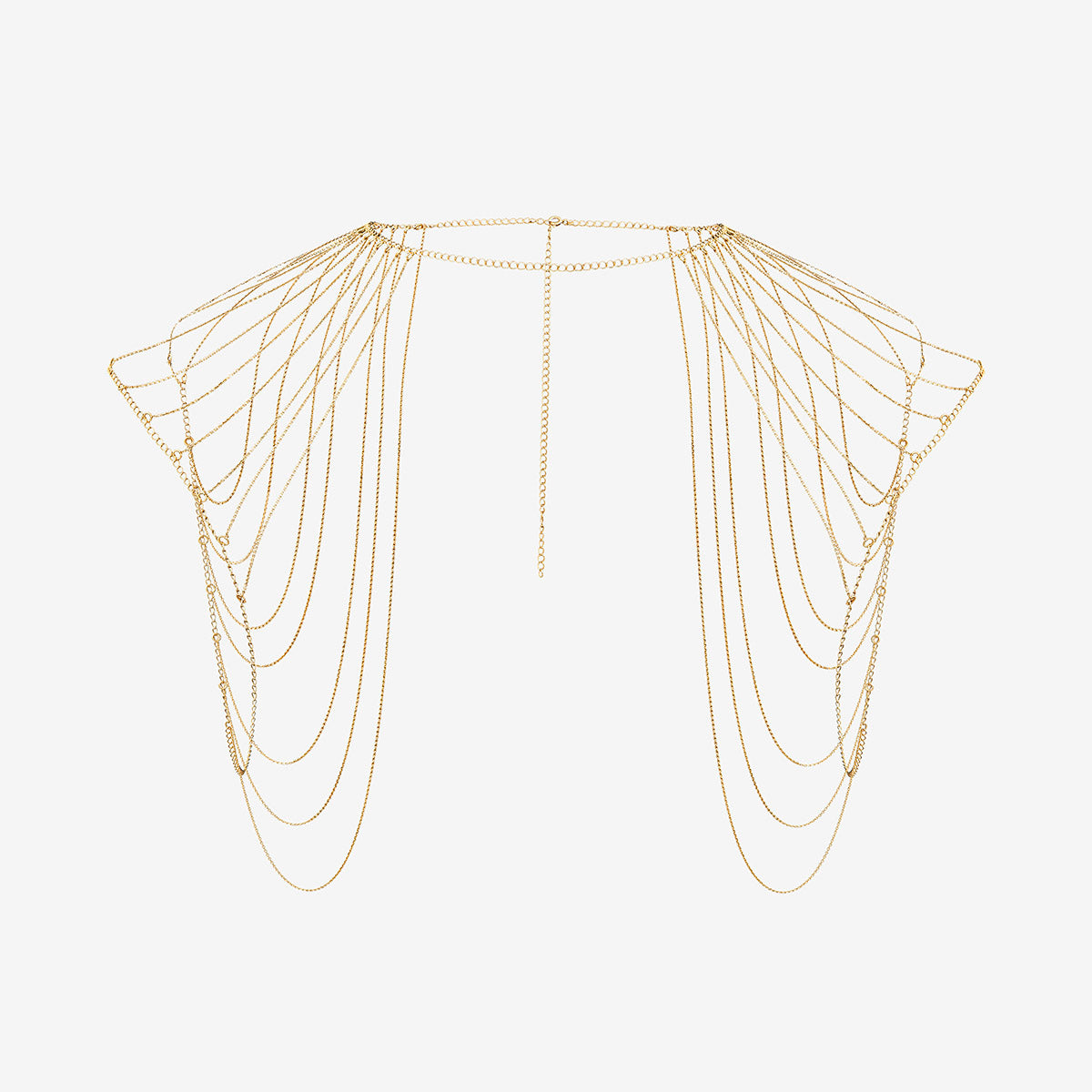 Caroline Najman 's GRACE gold shoulder jewelry is an elegant and bold piece that adds a unique touch to any outfit. This beautiful piece features several delicate gold chains that drape over the shoulders, creating a captivating visual effect.