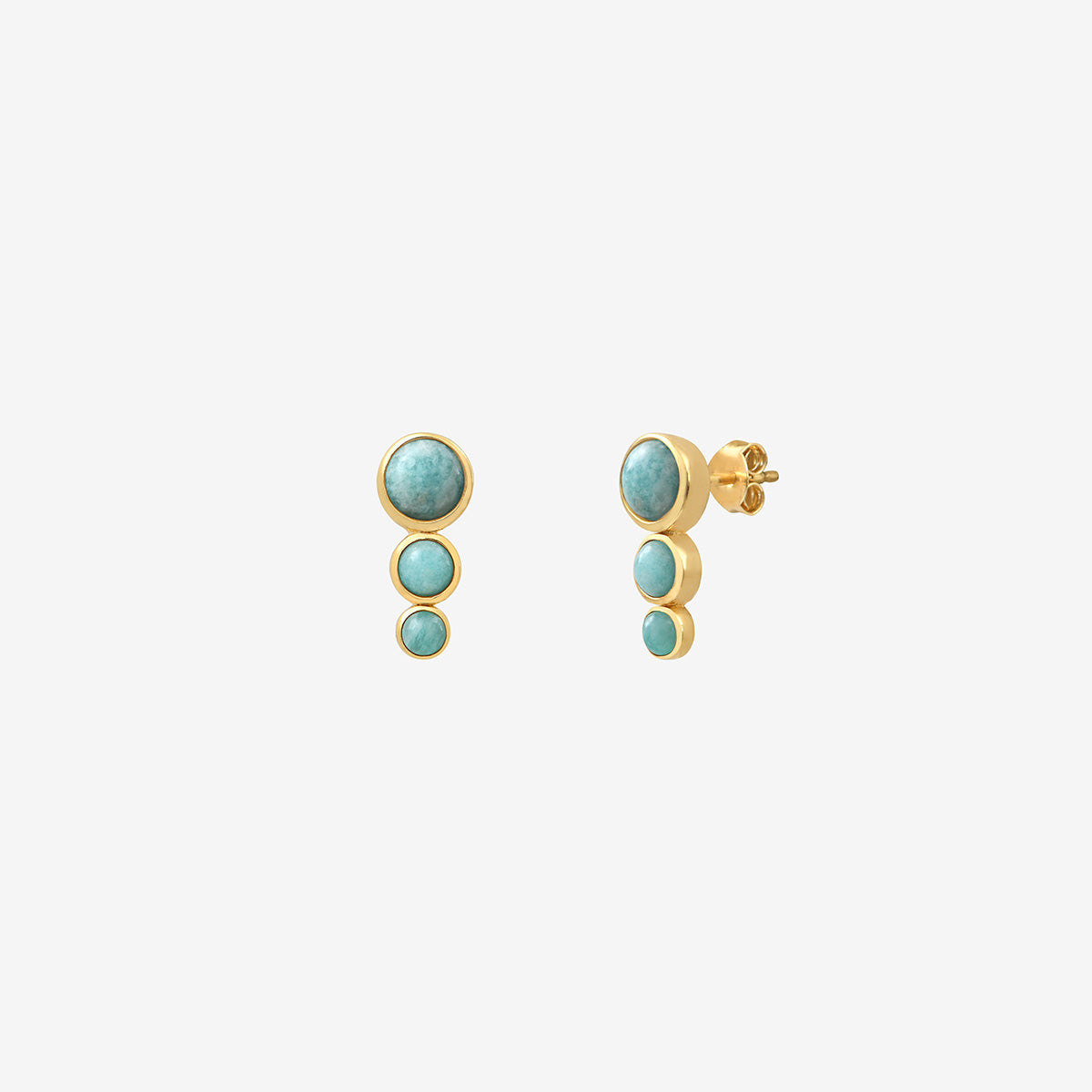 Each earring is adorned with three cabochons of fine stones , whose turquoise hue brings a note of freshness. These stones, in particular amazonite , are known to evoke the joy of living and promote communication. In astrology, amazonite is associated with the sign of Sagittarius .