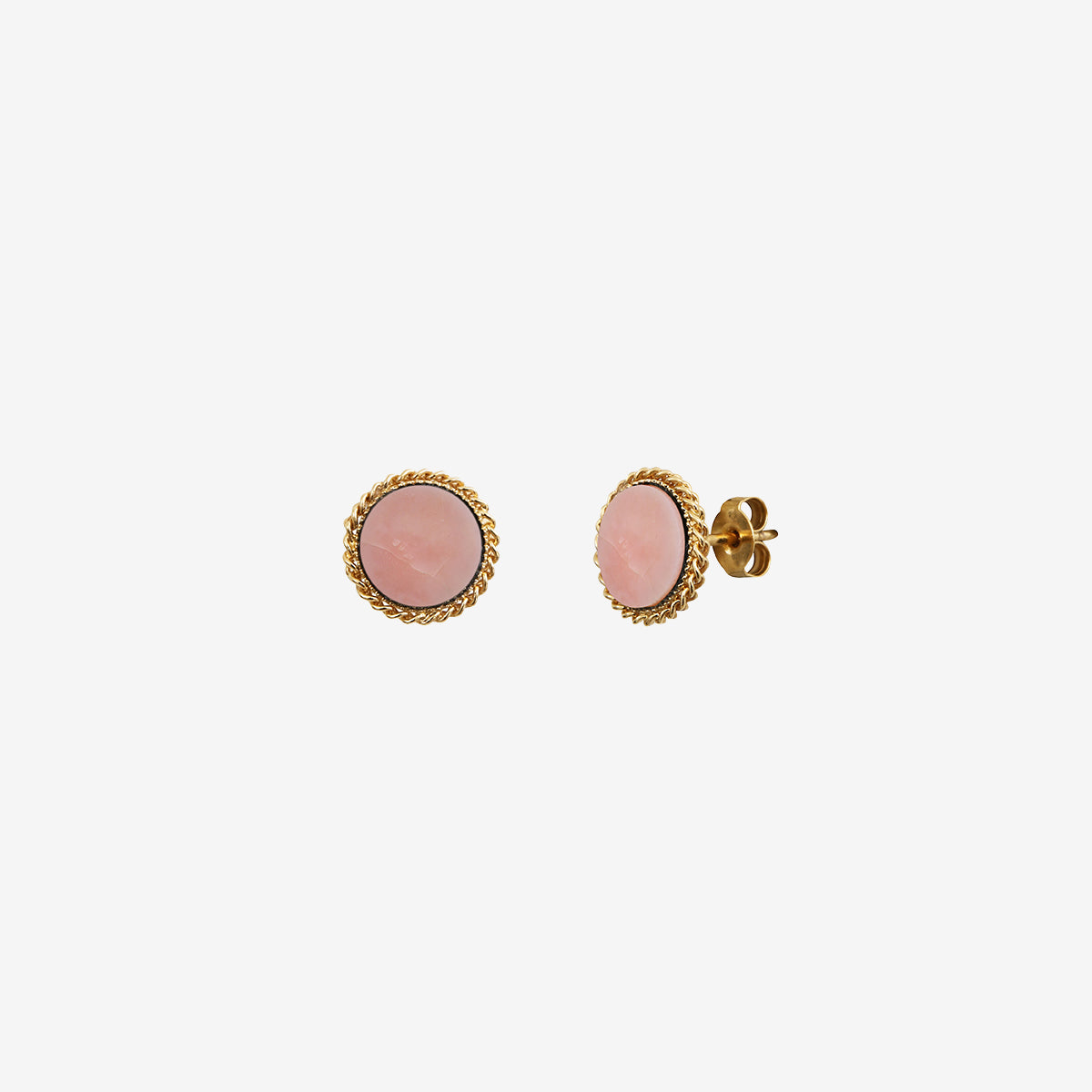 The elegant and delicate design of these earrings, with their pink cabochon surrounded by a golden braided border, makes them a perfect choice for various occasions, whether casual or formal. Their classic round shape easily adapts to different styles, adding a touch of sophistication to your look.