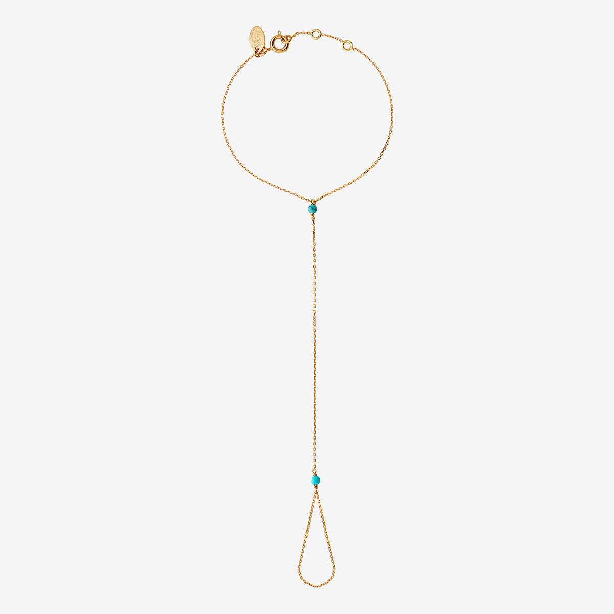 Ce bijou se distingue par sa chaîne fine qui relie le poignet à un anneau ressort fixé à un doigt, créant un effet cascade captivant. Deux petites pierres de turquoise ajoutent une note de couleur vive, symbolisant la communication et la sérénité. La turquoise est également connue pour inspirer le calme et l'amour, ce qui en fait un choix idéal pour celles qui recherchent à exprimer leur personnalité.
