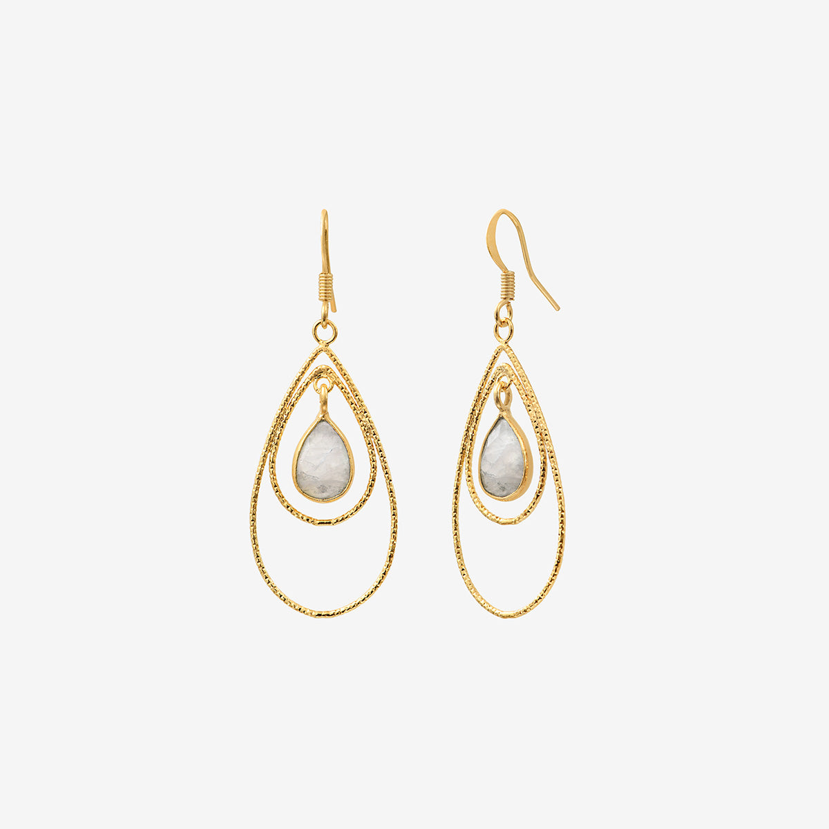 Chaque pièce est ornée de pierres de lune blanches, suspendues au centre de fines gouttes en fil diamenté, qui révèlent tout leur éclat. La pierre de lune est réputée pour sa capacité à adoucir les personnes trop sévères et à favoriser l'épanouissement maternel, tout en stimulant l'intuition et l'inspiration.