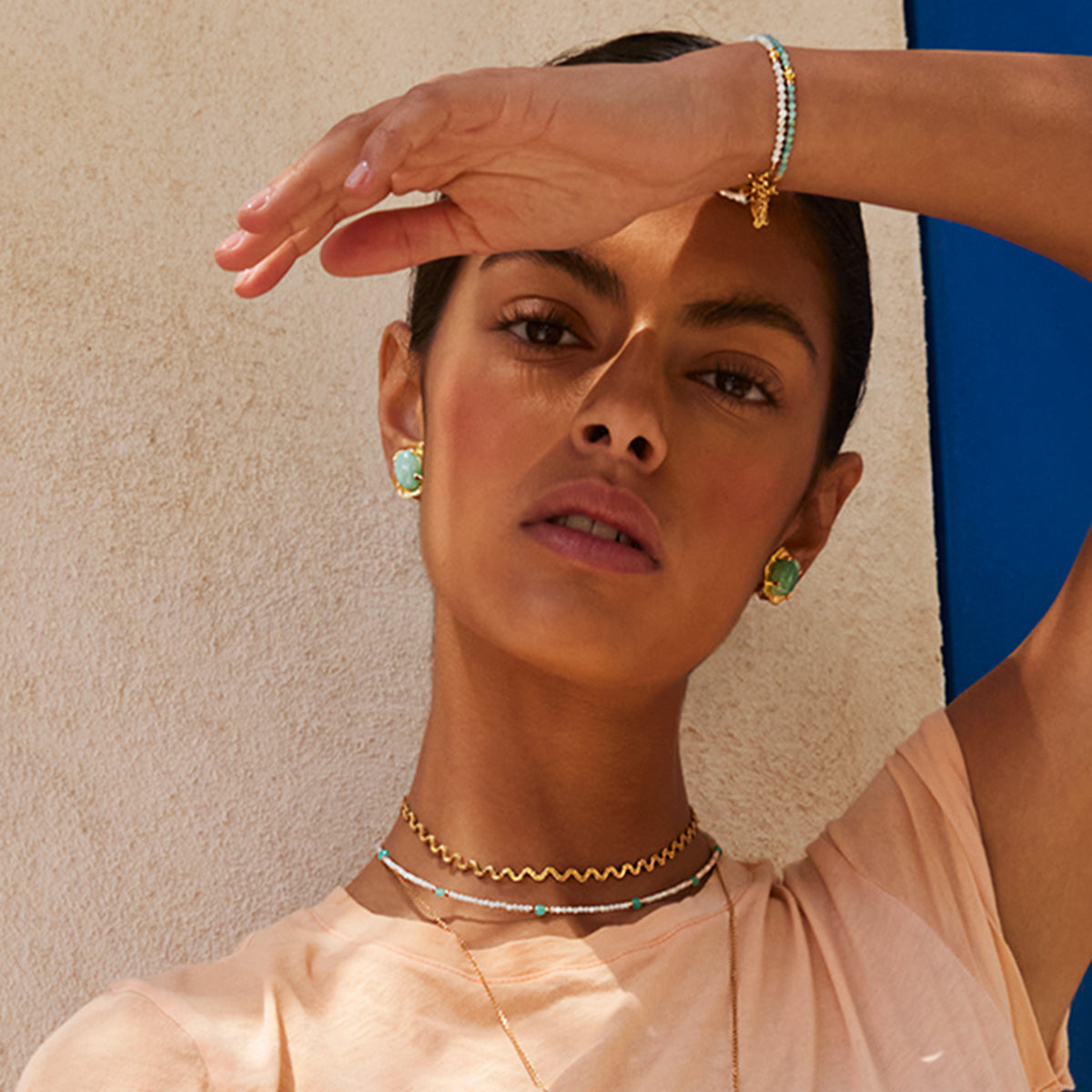 Le bracelet JERI de la marque Caroline Najman est un bijou raffiné qui allie élégance et délicatesse. Fabriqué en laiton doré à l'or fin 24 carats, chaque pièce est minutieusement confectionnée à la main, avec des perles en turquoise qui apportent une touche de couleur vibrante.