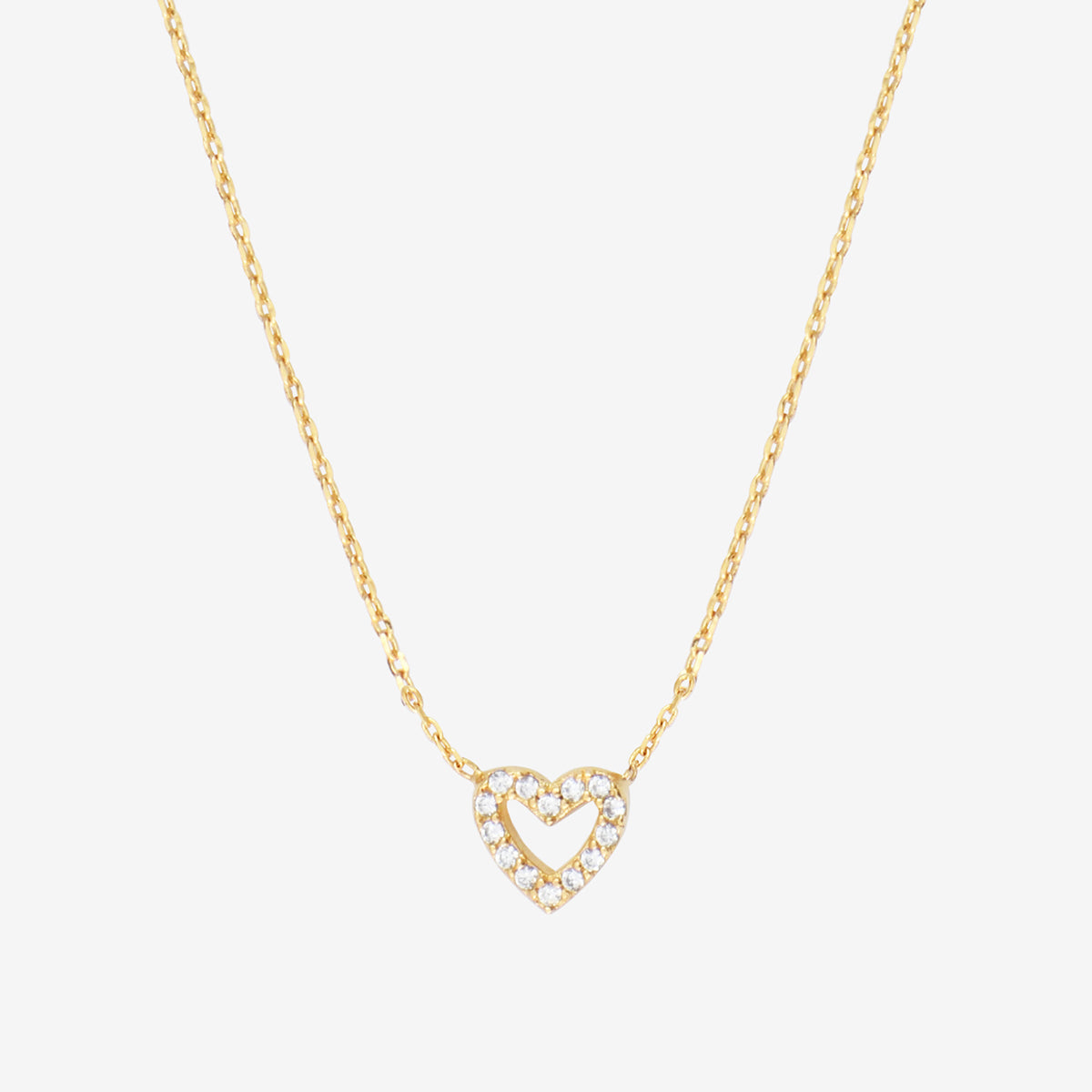Au centre, un pendentif en forme de cœur est serti de 14 oxydes de zirconium blancs, dont l'éclat franc et clair est dû à leurs propriétés exceptionnelles de captation et de diffusion de la lumière. Cette pierre, alternative idéale au diamant, est fabriquée en laboratoire, offrant ainsi une option éthique et durable.