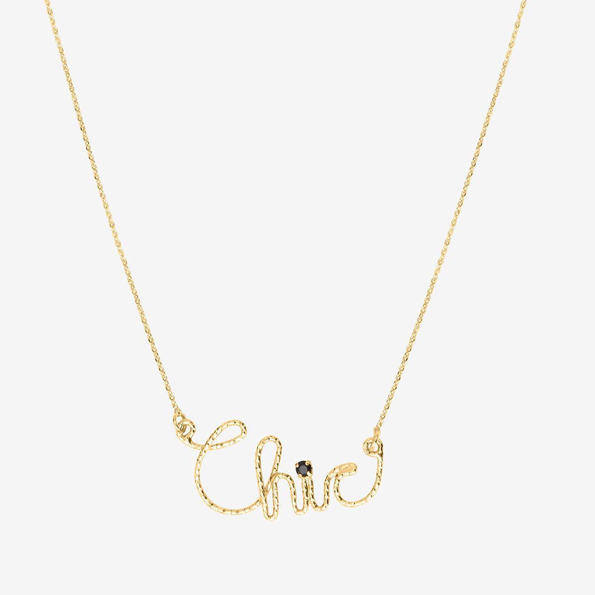 Le collier Bling est doré à l’or fin 24 carats. Le mot CHIC est façonnée à la main à partir d'un fil diamanté pour apporter une émotion, un souvenir ou un état d'esprit à vos looks.