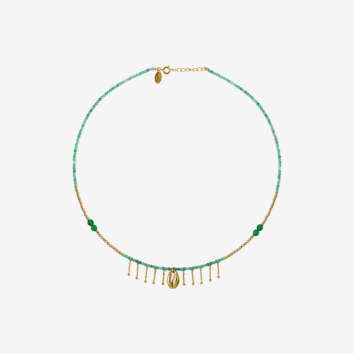 Le collier doré Esmé de la collection INDIE est un bijou élégant et raffiné, conçu pour apporter une touche de sophistication à toutes vos tenues. Fabriqué en laiton doré à l'or fin 24 carats, ce collier se distingue par son mélange harmonieux de couleurs, alliant le doré et un vert vibrant grâce à ses perles d'agate verte.